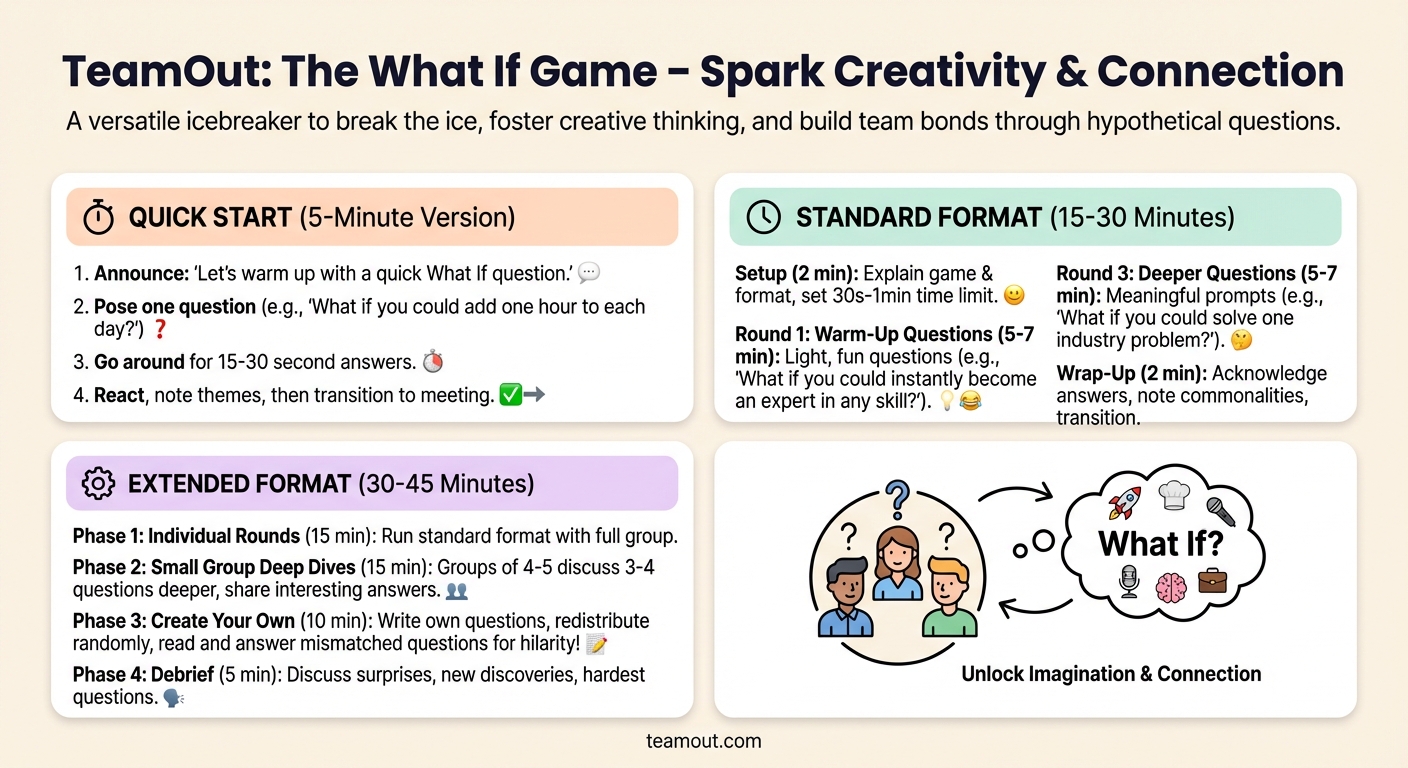 The game's magic lies in its flexibility. You can keep it light with absurd scenarios ("What if pizza was declared a vegetable?") or go deeper with thought-provoking prompts ("What if you could solve one world problem overnight?"). This adaptability makes it perfect for any team context — from quick meeting warm-ups to extended retreat activities.