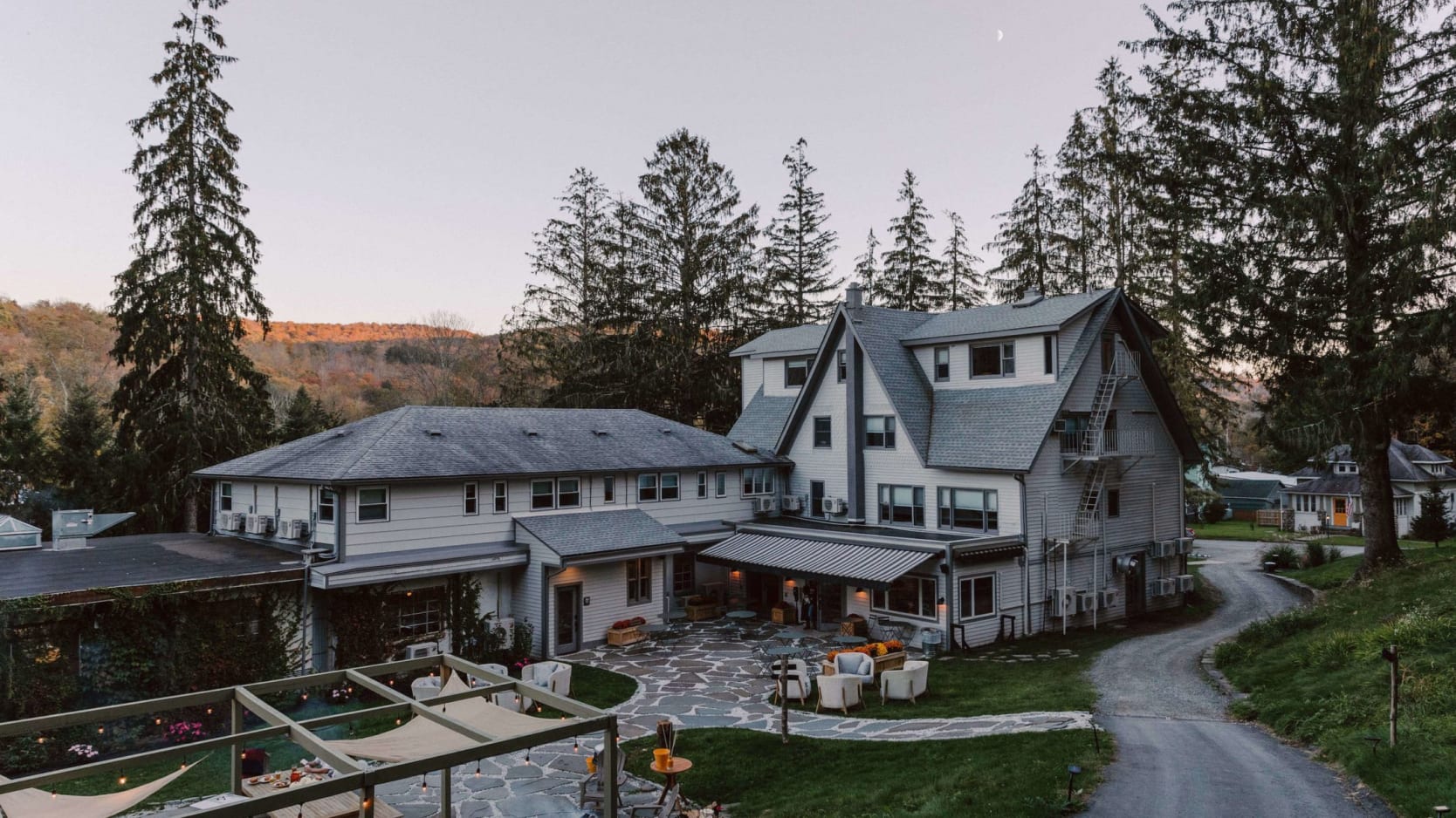 Amenities include a restaurant and bar, outdoor pool, and fire pits. Activities available include hiking, swimming, lawn games, and seasonal programming. Nearby options include fishing, kayaking, and visiting small towns in the Catskills.